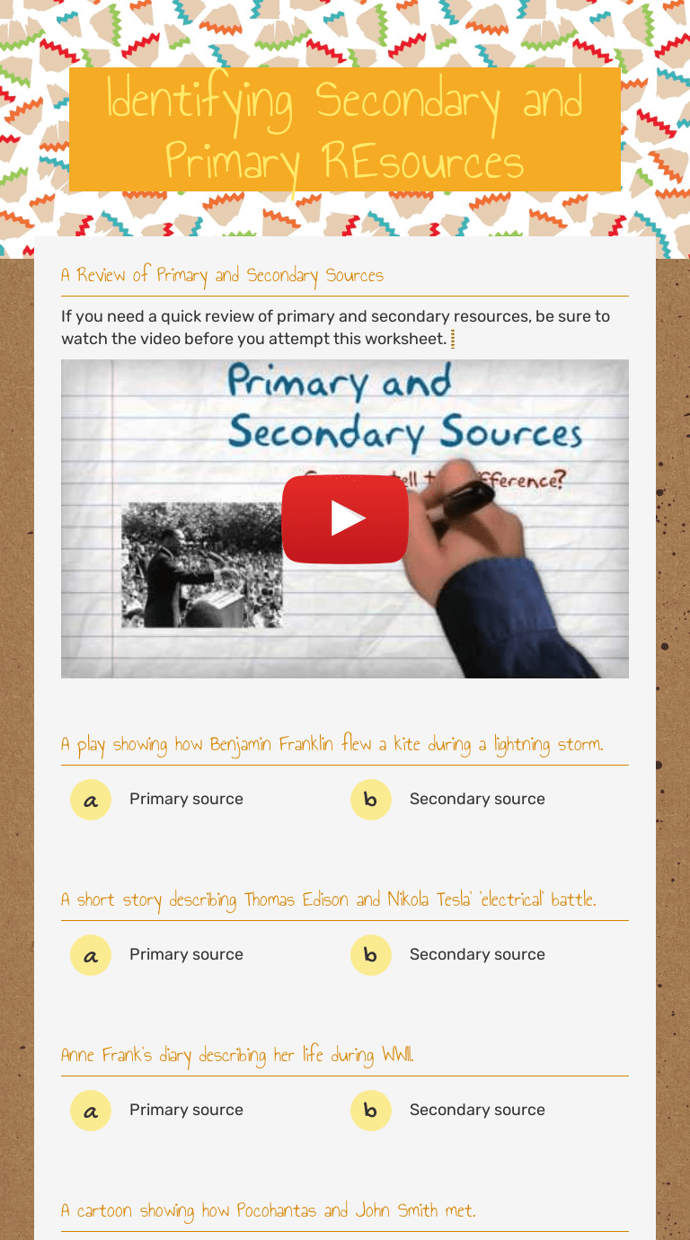 Primary consumer secondary consumer tertiary consumer asq fi3h qaternary consumer next come organisms that eat the autottophs; •a primary source is information that was created at the same time as an event or by a person directly involved in the event. You can use our analyzing documents tool to create online activities, or these worksheets — for photos, written documents, artifacts, posters, maps, cartoons, videos, and sound recordings — to teach your students the process … Identifying primary and secondary sources determine if the source would be a primary source (p) or a secondary source (s). Information found in pubmed, cinahl, scopus, and other databases can help you determine whether the article you're looking at is primary or secondary.